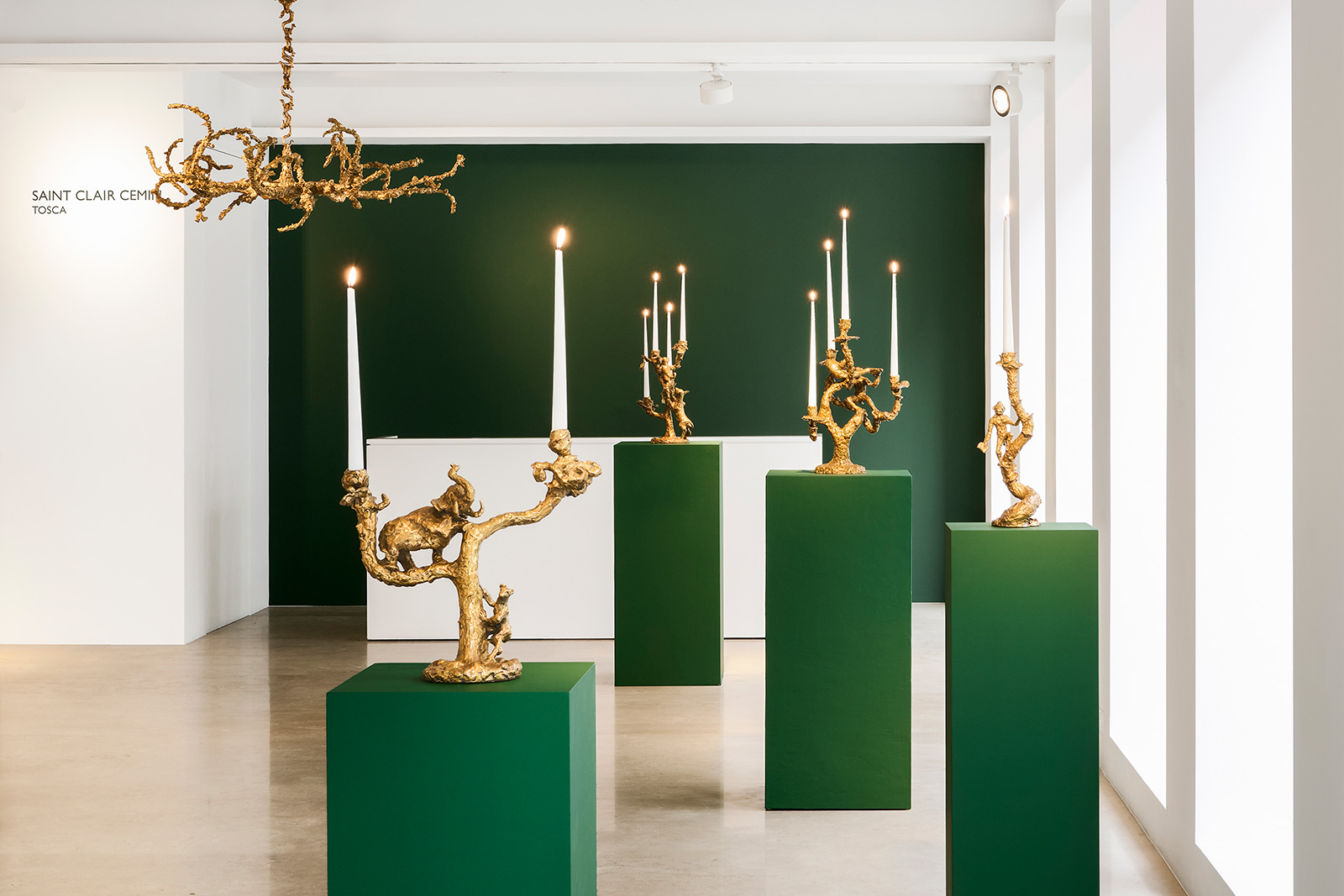 The new collection of bronze works includes five candle holders, seating, tables, and a chandelier. The series revolves around a sense of warmth that arises through storytelling, with whales dozing in the branches of trees, monkeys swinging through the air clutching books, and a chandelier stretching out like a spider’s web of bronze. “I decided to do something a little more fun,” says Cemin. “Animal comes from the word anima. It’s what gives soul to something, makes it animated. If it’s not animals that animate the work, the form has to do it.”